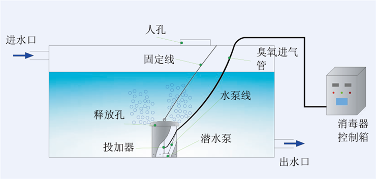 電控柜在臭氧發(fā)生管中產(chǎn)生臭氧,通過內(nèi)置氣泵將臭氧輸送到投加器中。投加器內(nèi)置氣液混合泵,使水箱中水與臭氧充分混合,并使水循環(huán)流動(dòng),達(dá)到對水體及水箱內(nèi)壁的消毒效果。